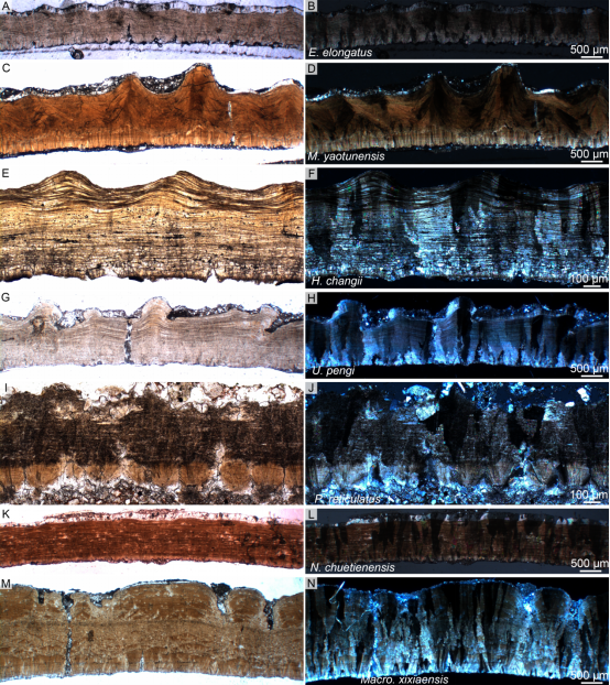结合多种手段,研究人员在这些蛋壳中发现了更丰富的方解石晶粒形态和排列特征,其中包括一些新的鉴定特征和不具鉴定意义的病态结构等。根据新的发现,研究人员提出常氏黑山蛋(Heishanoolithus changii)与网纹副长形蛋(Paraelongatoolithus reticulatus)不再属于长形蛋类,主田南雄蛋(Nanhsiungoolithus chuetienensis)的归属也需进一步考察。据此,目前中国的长形蛋类包括长形蛋科(Elongatoolithidae)的长形蛋属(Elongatoolithus)、巨形蛋属(Macroolithus)、波纹蛋属(Undulatoolithus)以及巨型长形蛋科(Macroelongatoolithidae)的巨型长形蛋属(Macroelongatoolithus)和巨型纺锤蛋属(Megafusoolithus),南雄蛋属(Nanhsiungoolithus)仍暂归于长形蛋科。