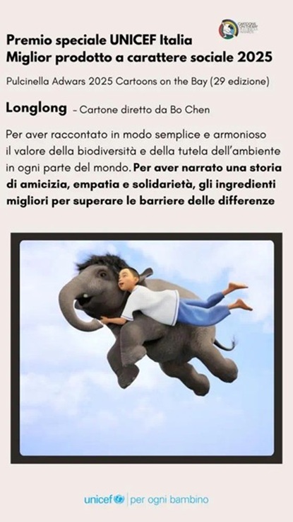 近日,由上海科技馆与上海美术电影制片厂联合出品的4D动画片《象之童话》(LONGLONG)荣获第二十九届意大利海湾国际卡通节(Cartoons on the Bay)“联合国儿童基金会奖”(Unicef Award)。该奖项旨在表彰在儿童内容创作中展现社会责任与积极价值的优秀作品。