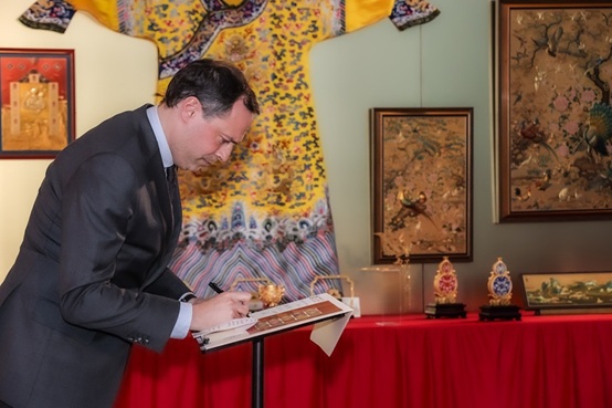 (从左至右)王跃工、艾略特·明钦伯格、耿爽、阿图尔·哈雷魏为故宫博物院成立100周年邮票发布仪式启幕