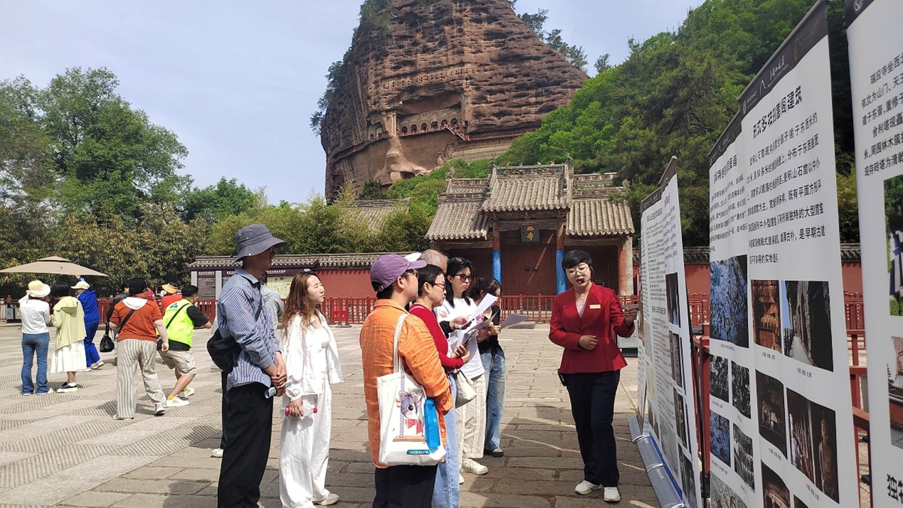 此外,麦积山石窟艺术研究所在石窟广场举办“文化长廊话古今”主题展,分“艺术瑰宝”“守护之路”2个篇章,回顾麦积山石窟开凿历史,展现文物保护历程与工作纪实,引导公众理解文化遗产保护的重要意义。西千佛洞文物保护研究所在窟区开展了国际博物馆日和文化遗产相关知识的宣传活动。